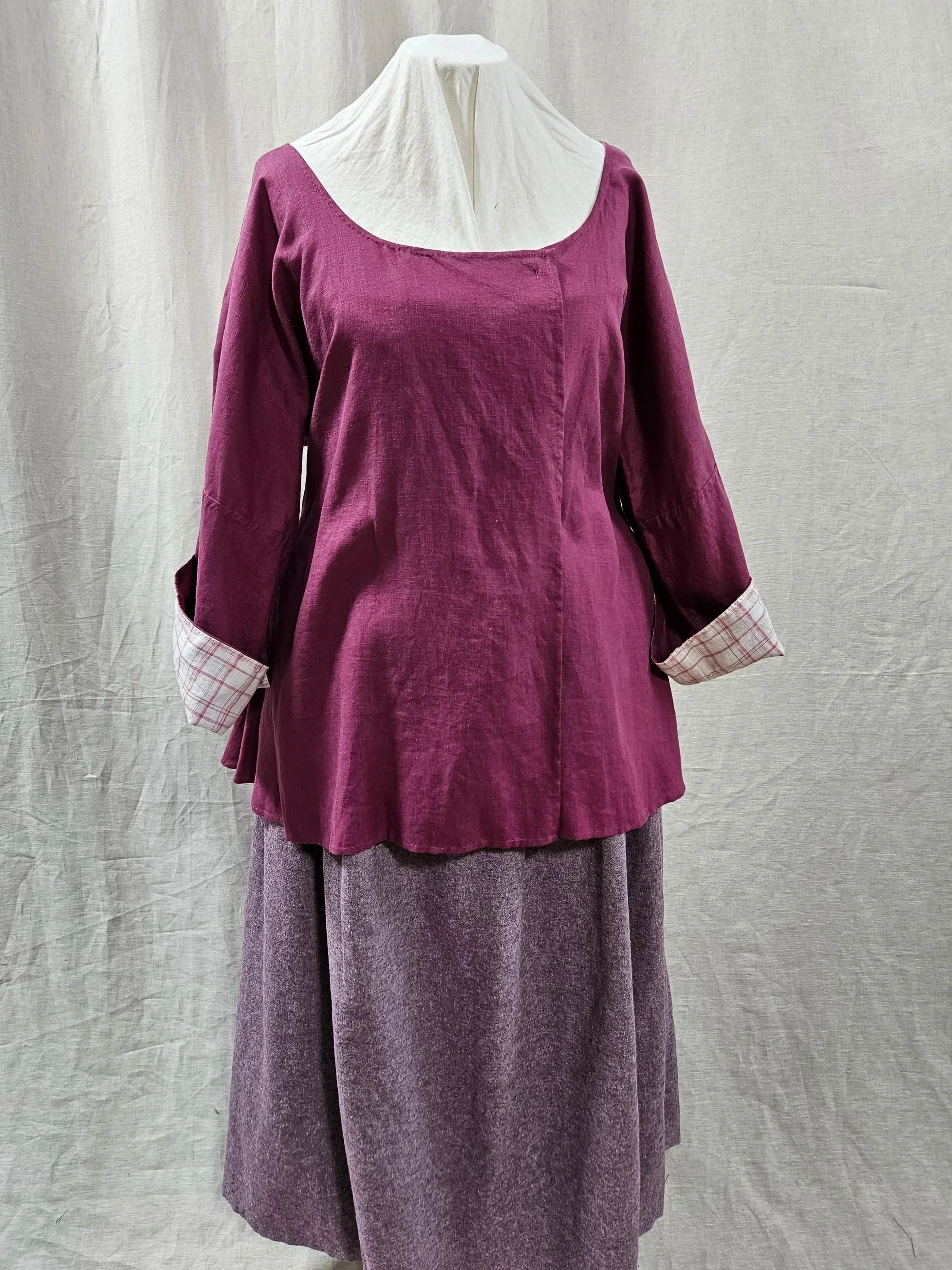 Have three tapering pleats at the back, creating a fitted, conical shape (Colonial era) Or gathered drawstring at the neckline and on an interior drawstring across the shoulder blade area (Federal/Transitional era).