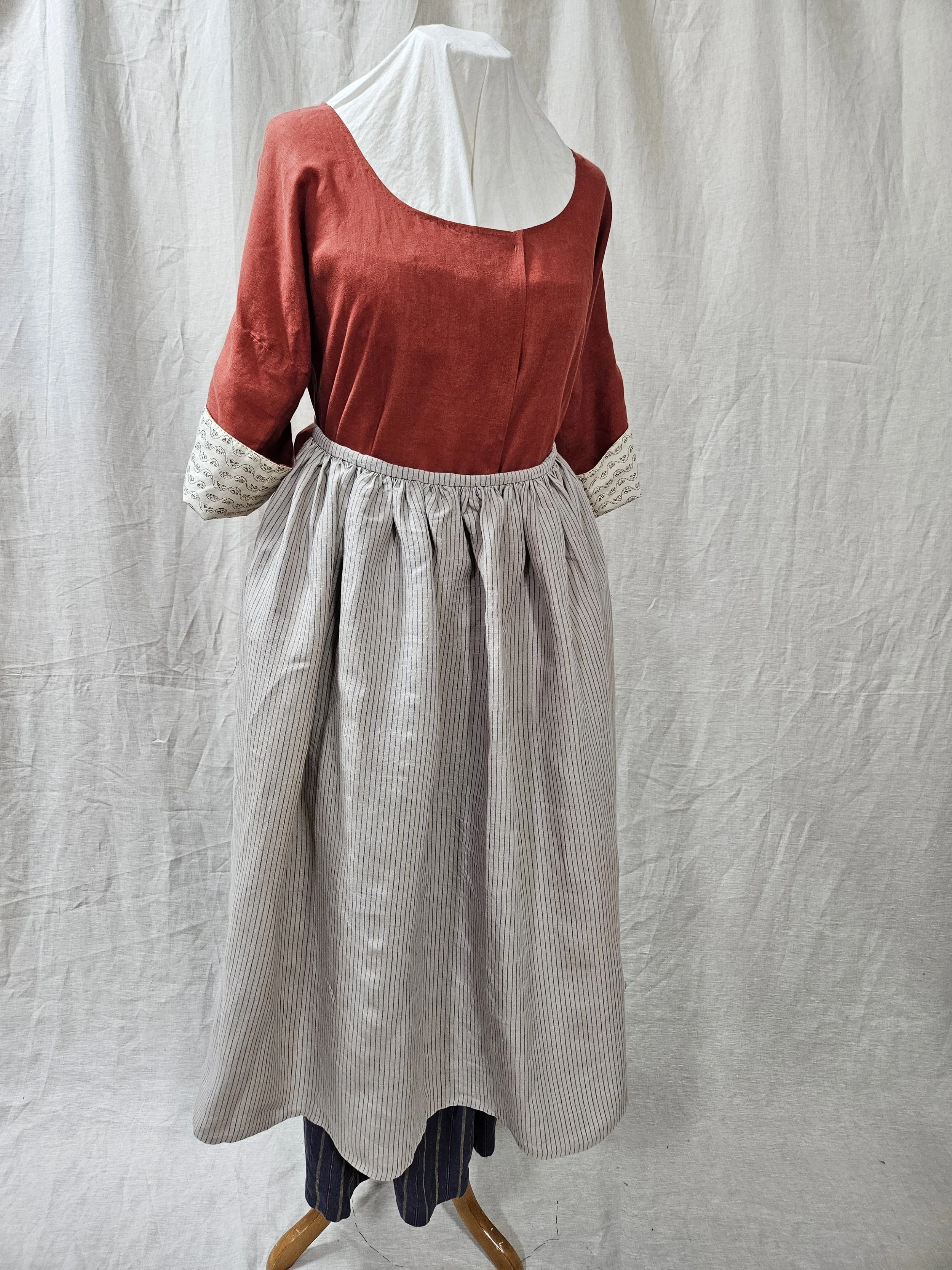 Are gathered to a fixed waistband with long twill tape ties (not on a drawstring).
