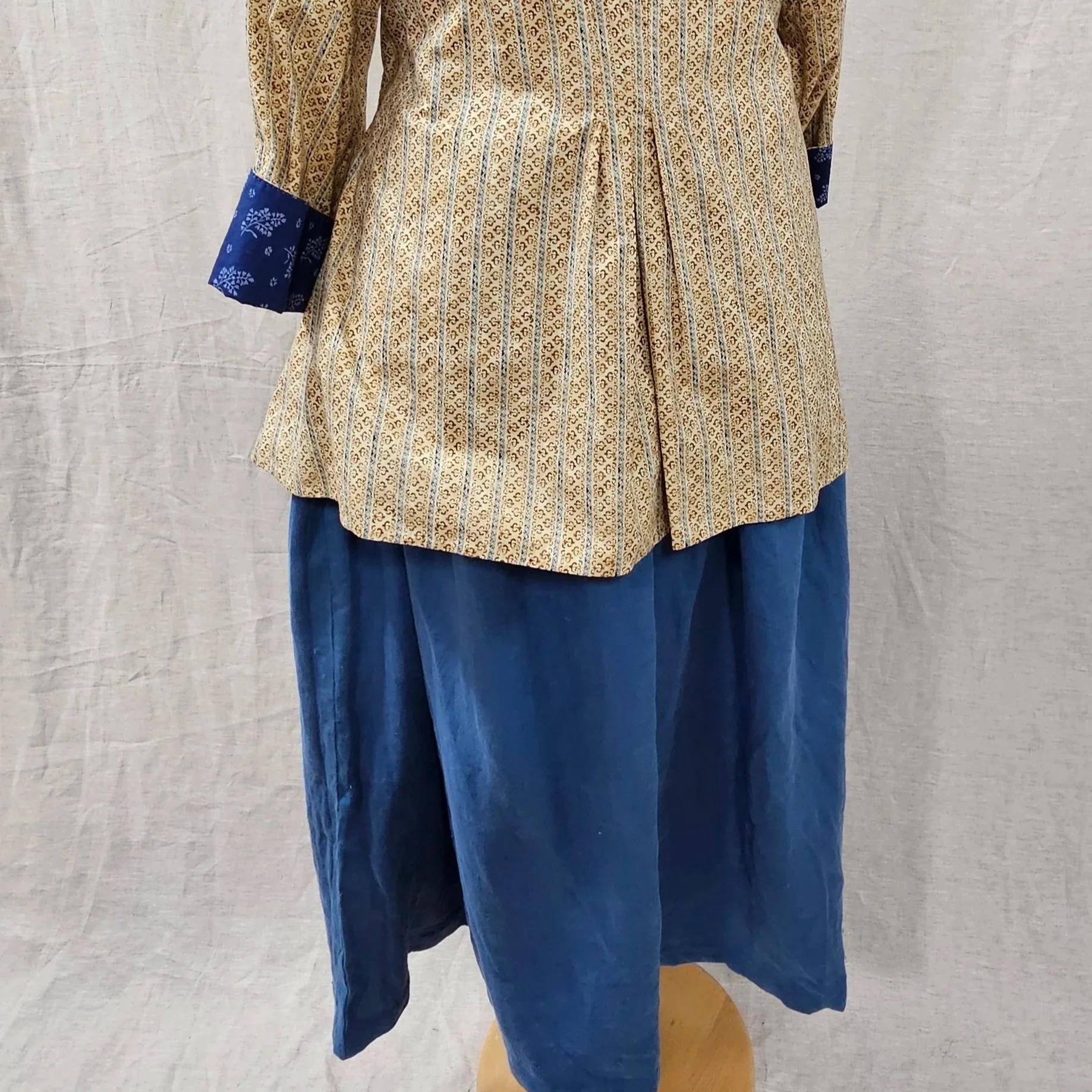 Feature fixed, pleated waistbands with long twill tape ties (neither gathered nor on a drawstring).