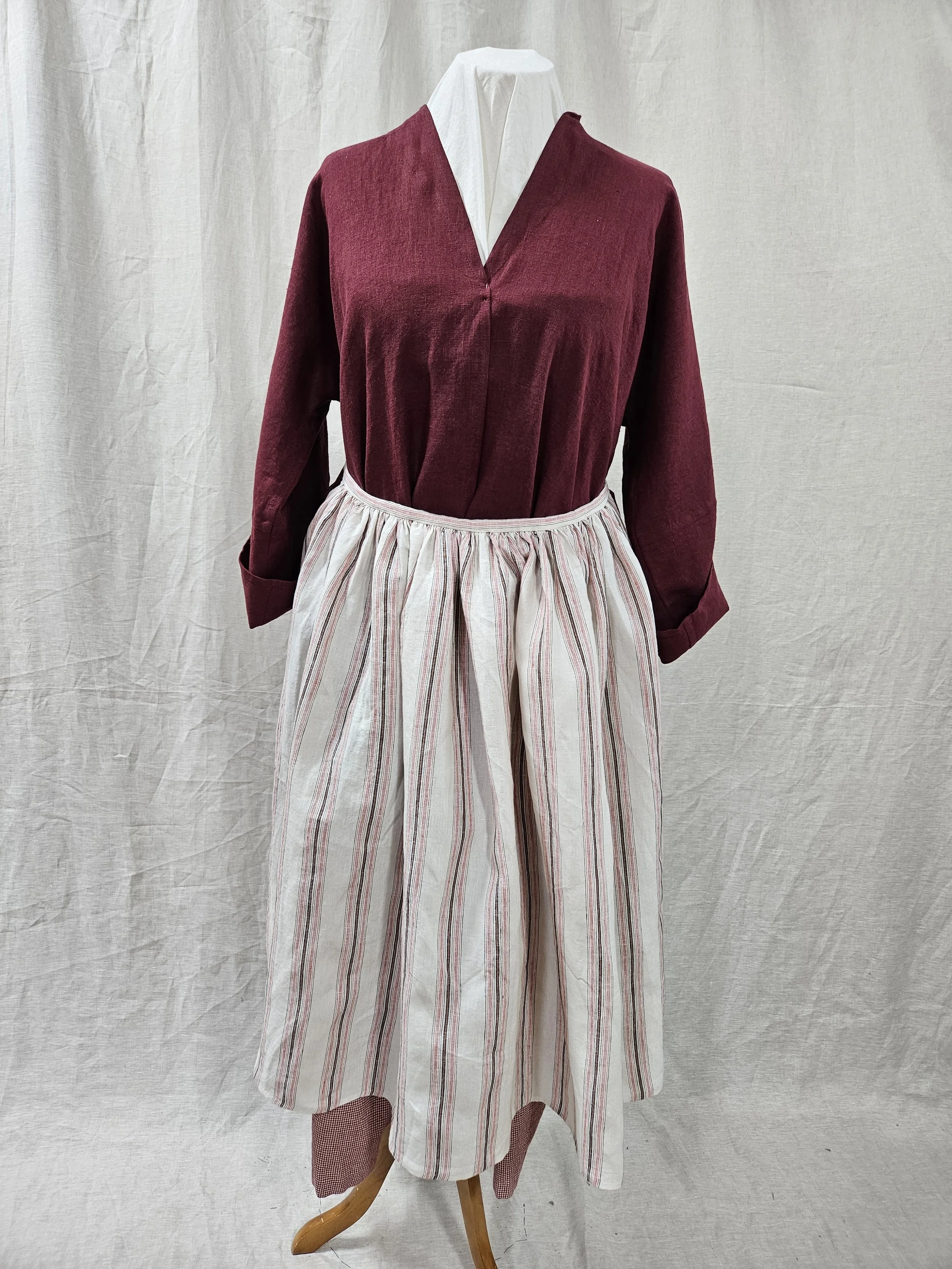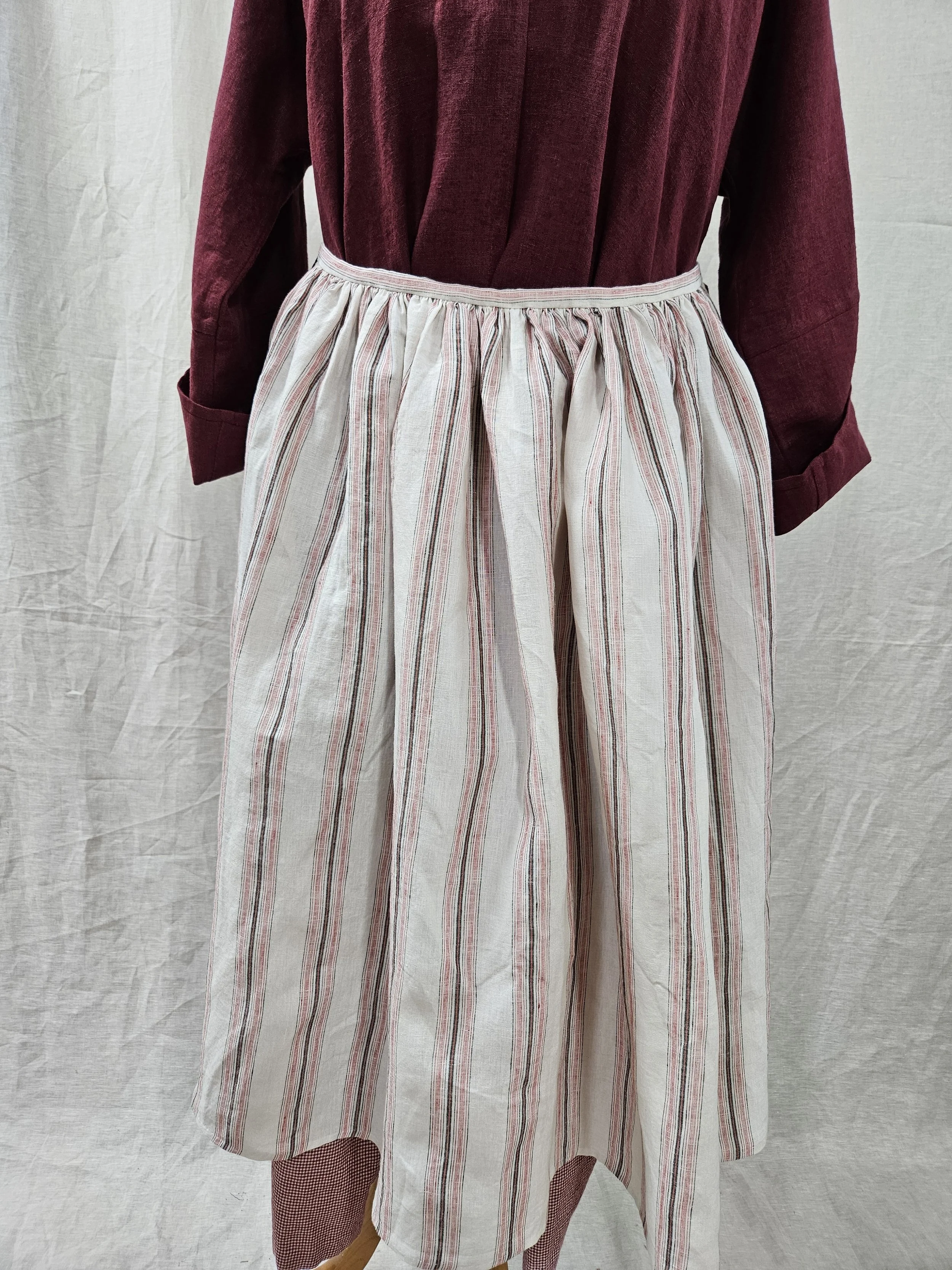 Are gathered to a fixed waistband with long twill tape ties (not on a drawstring).