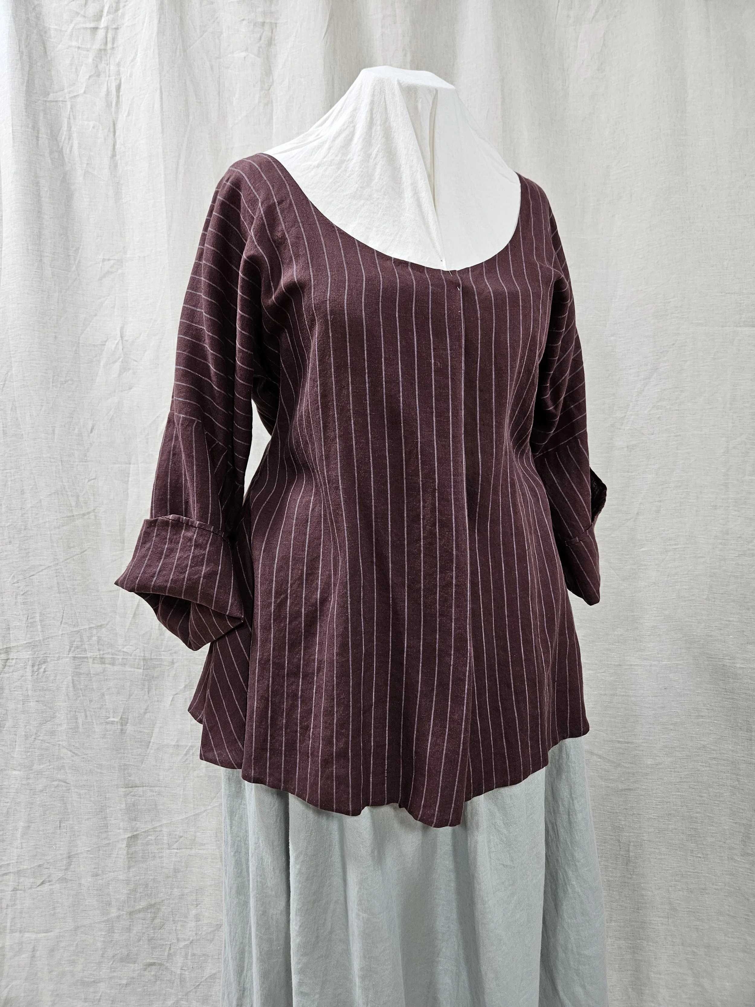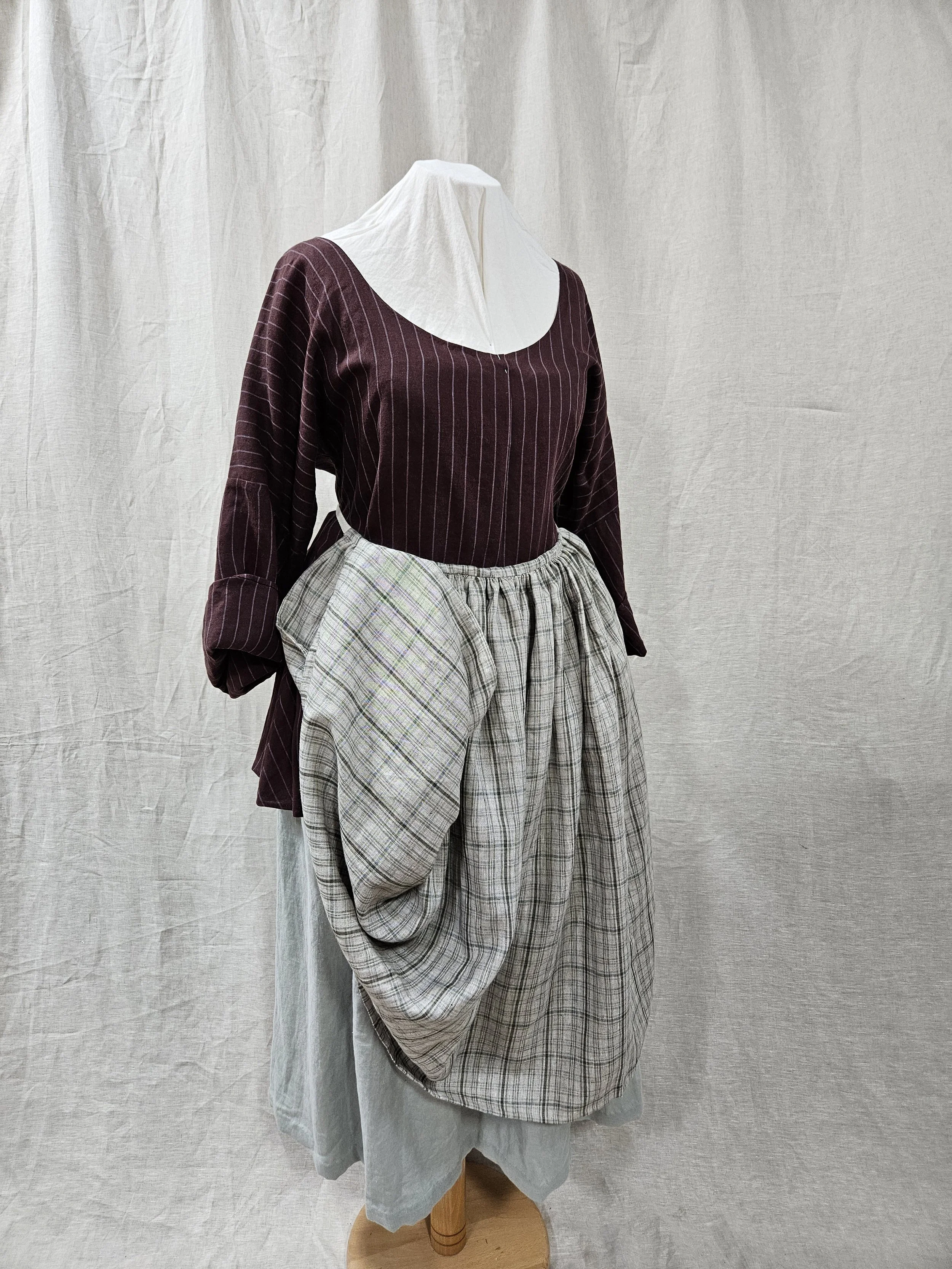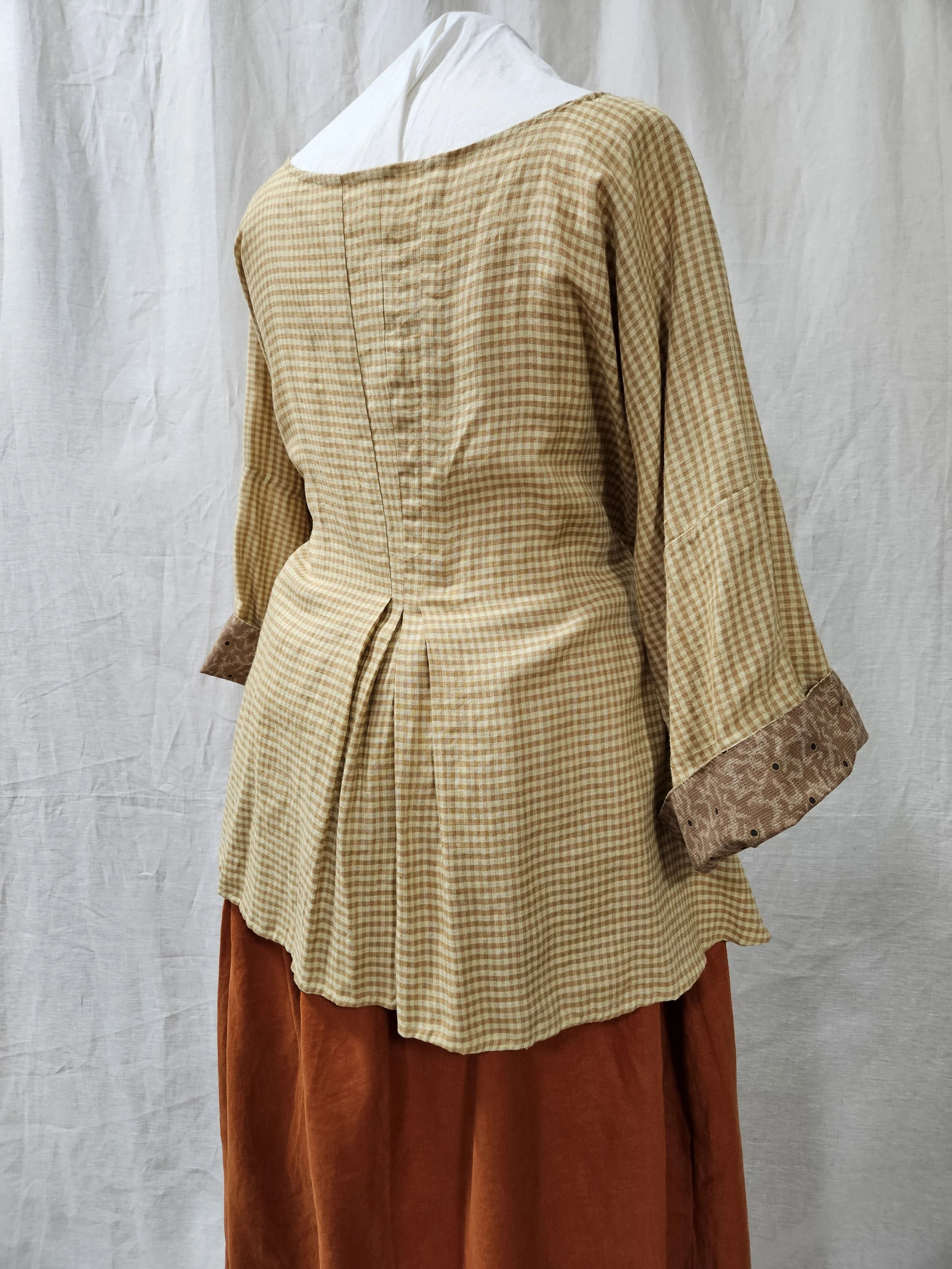 Have three tapering pleats at the back, creating a fitted, conical shape (Colonial era)Orgathered drawstring at the neckline and on an interior drawstring across the shoulder blade area (Federal/Transitional era).