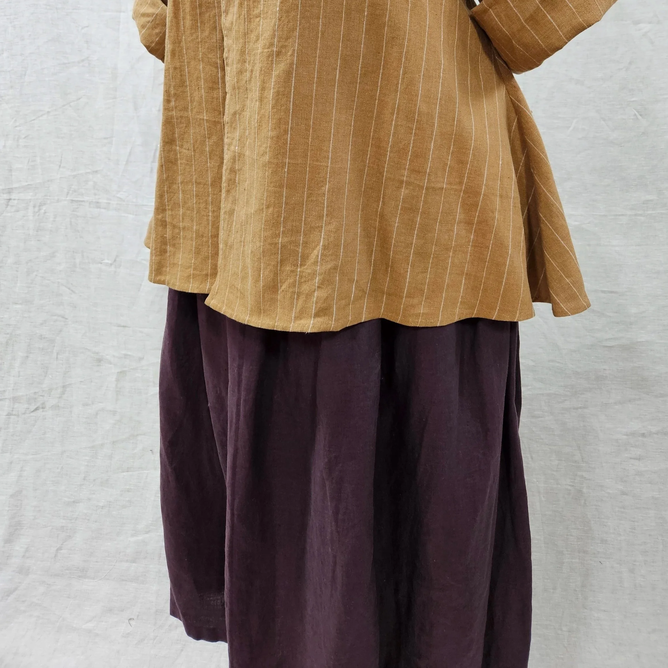 Feature fixed, pleated waistbands with long twill tape ties (neither gathered nor on a drawstring).