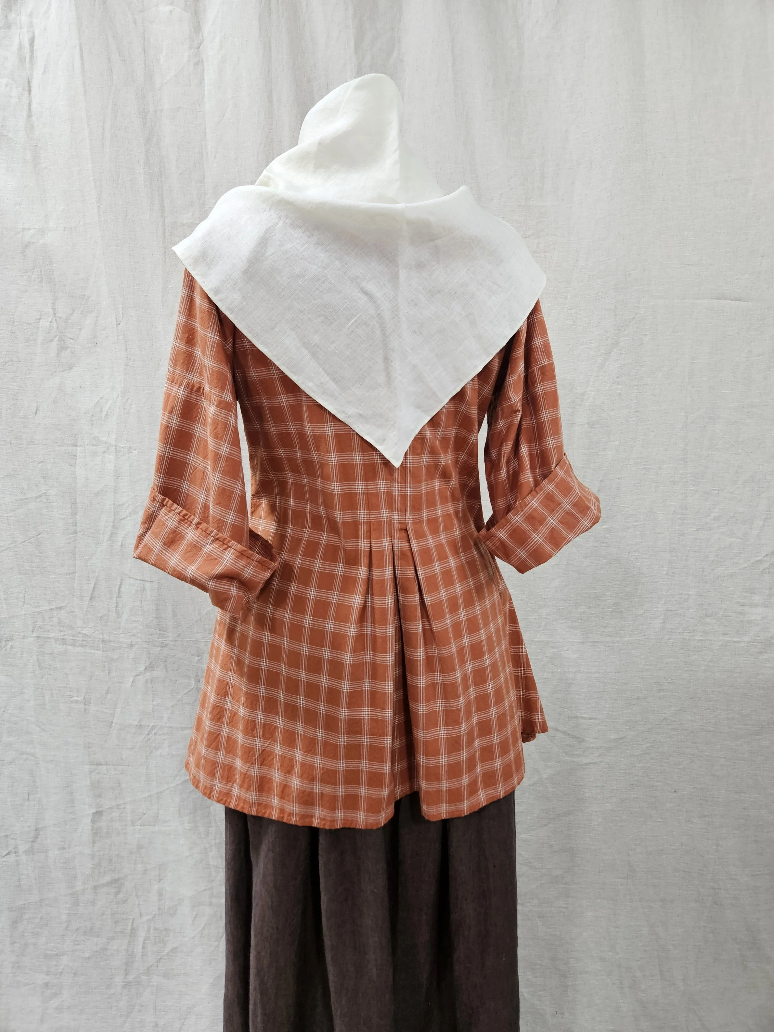 Have three tapering pleats at the back, creating a fitted, conical shape (Colonial era) Orgathered drawstring at the neckline and on an interior drawstring across the shoulder blade area (Federal/Transitional era).