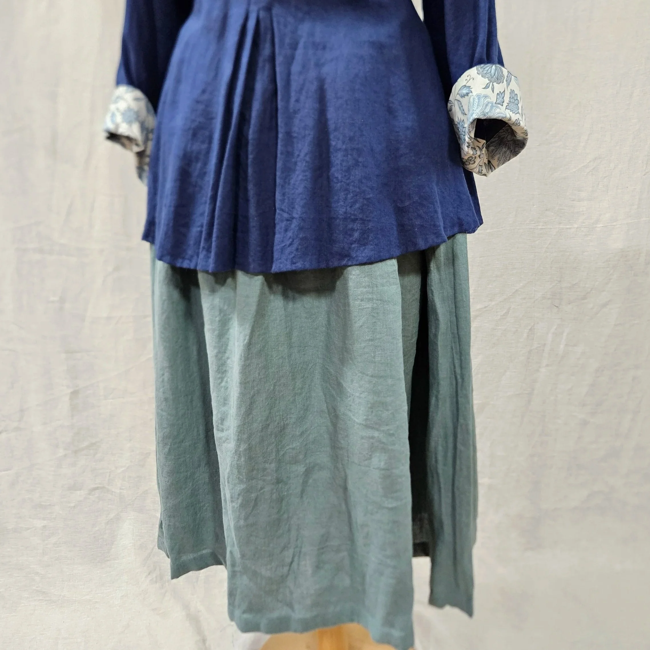Feature fixed, pleated waistbands with long twill tape ties (neither gathered nor on a drawstring).
