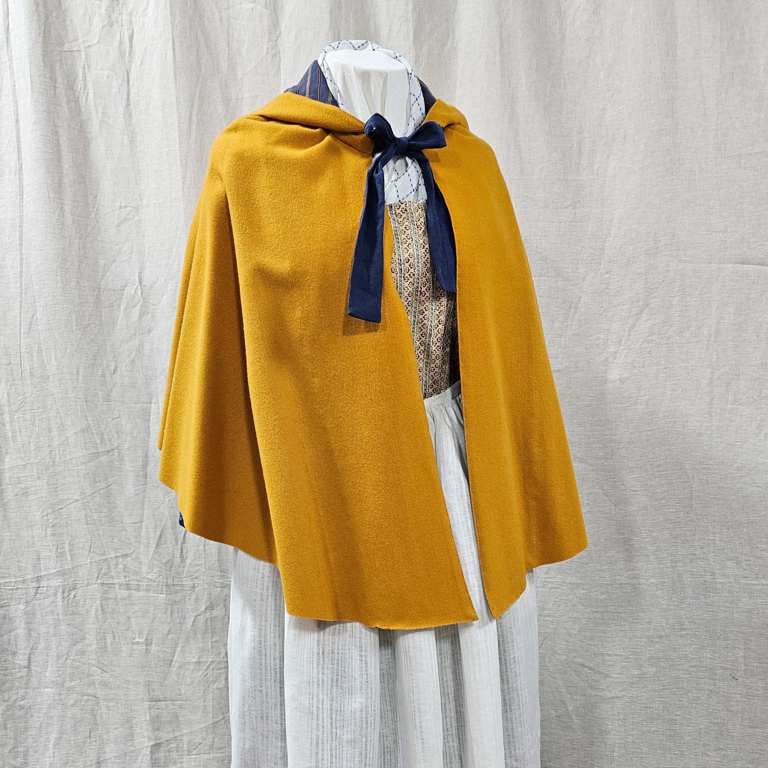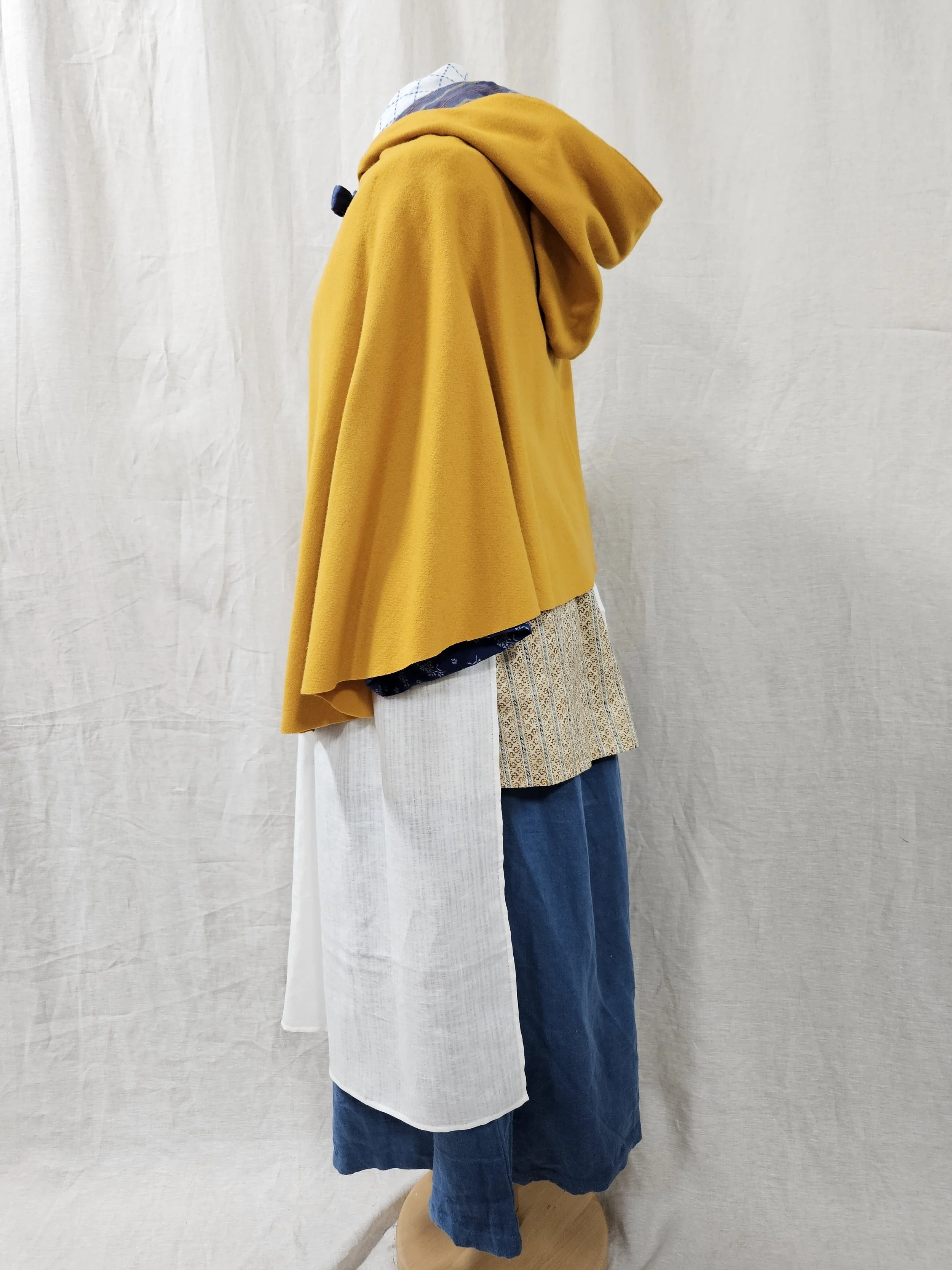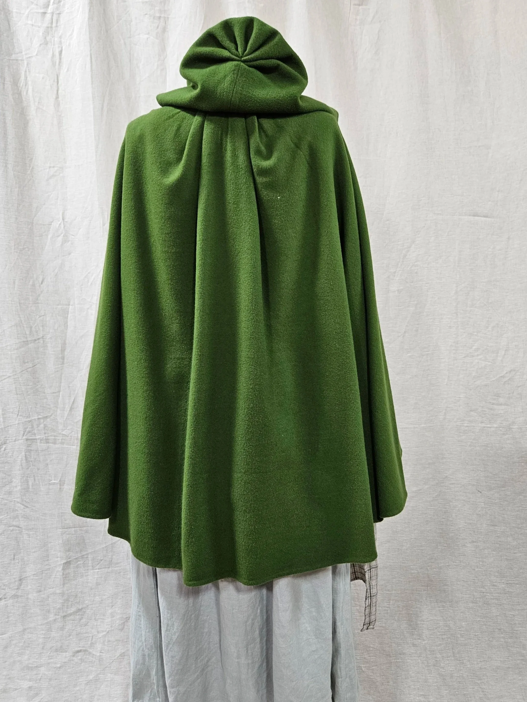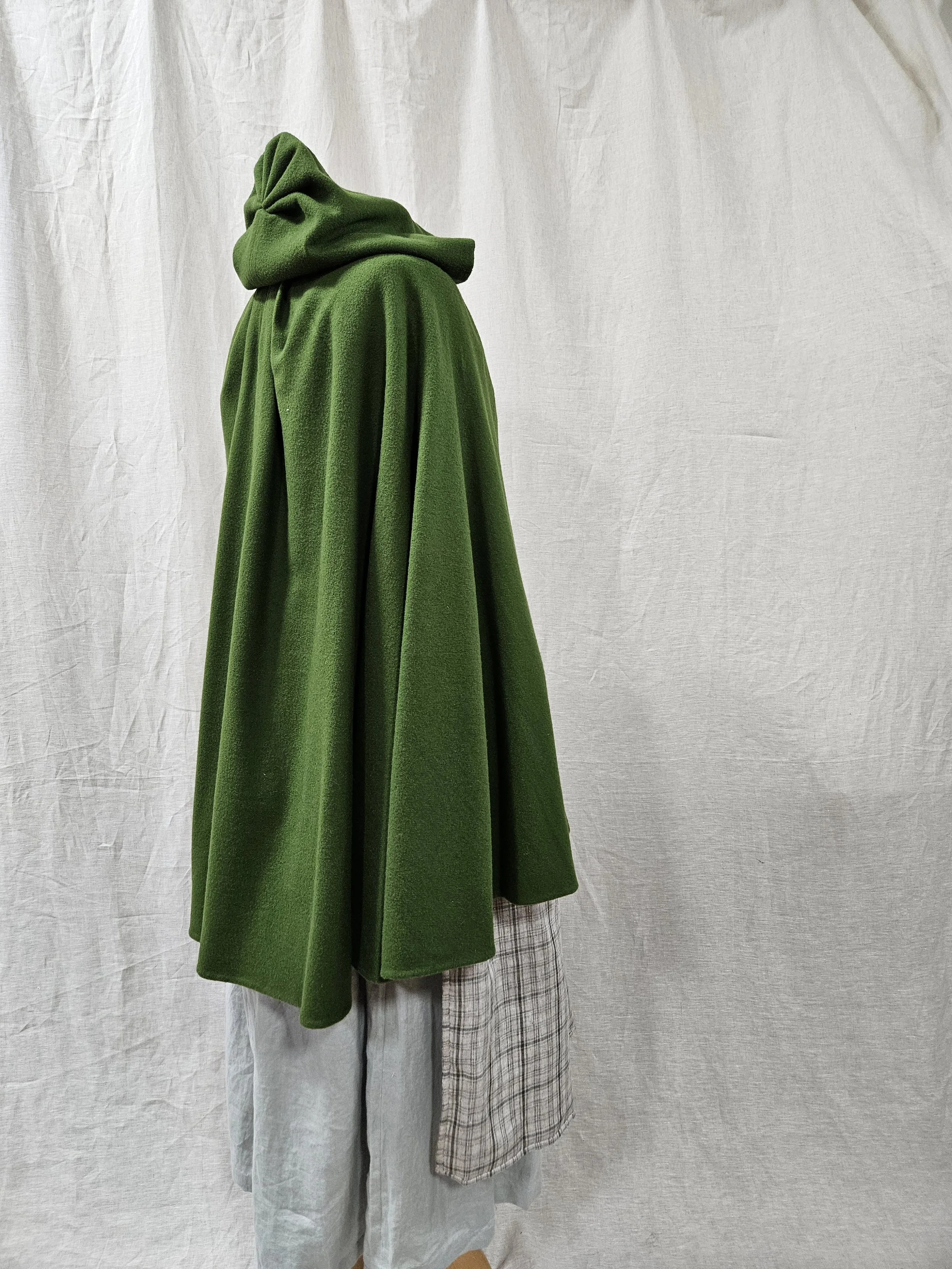 This hooded Short cloak has a 100% wool outer fabric, and 100% linen facing